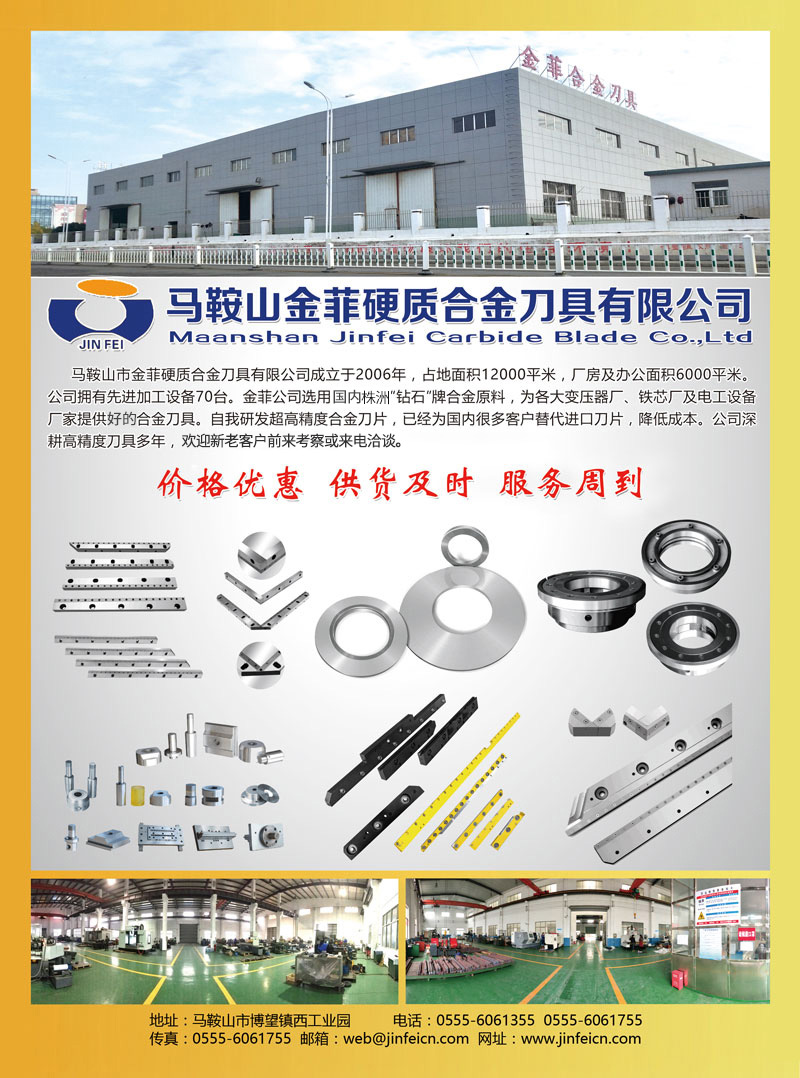 馬鞍山市金菲硬質(zhì)合金刀具有限公司成立于2006年,占地面積12000平米,廠房及辦公面積6000平米。公司擁有加工設(shè)備70臺(tái)。金菲公司選用國(guó)內(nèi)有名'鉆石"牌合金原料,為各大變壓器廠、鐵芯廠及電工設(shè)備廠家提供合金刀具。自我研發(fā)超高精度合金刀片,已經(jīng)為國(guó)內(nèi)很多客戶替代進(jìn)口刀片,降低成本。公司深耕高精度刀具多年,歡迎新老客戶前來(lái)考察或來(lái)電洽談。